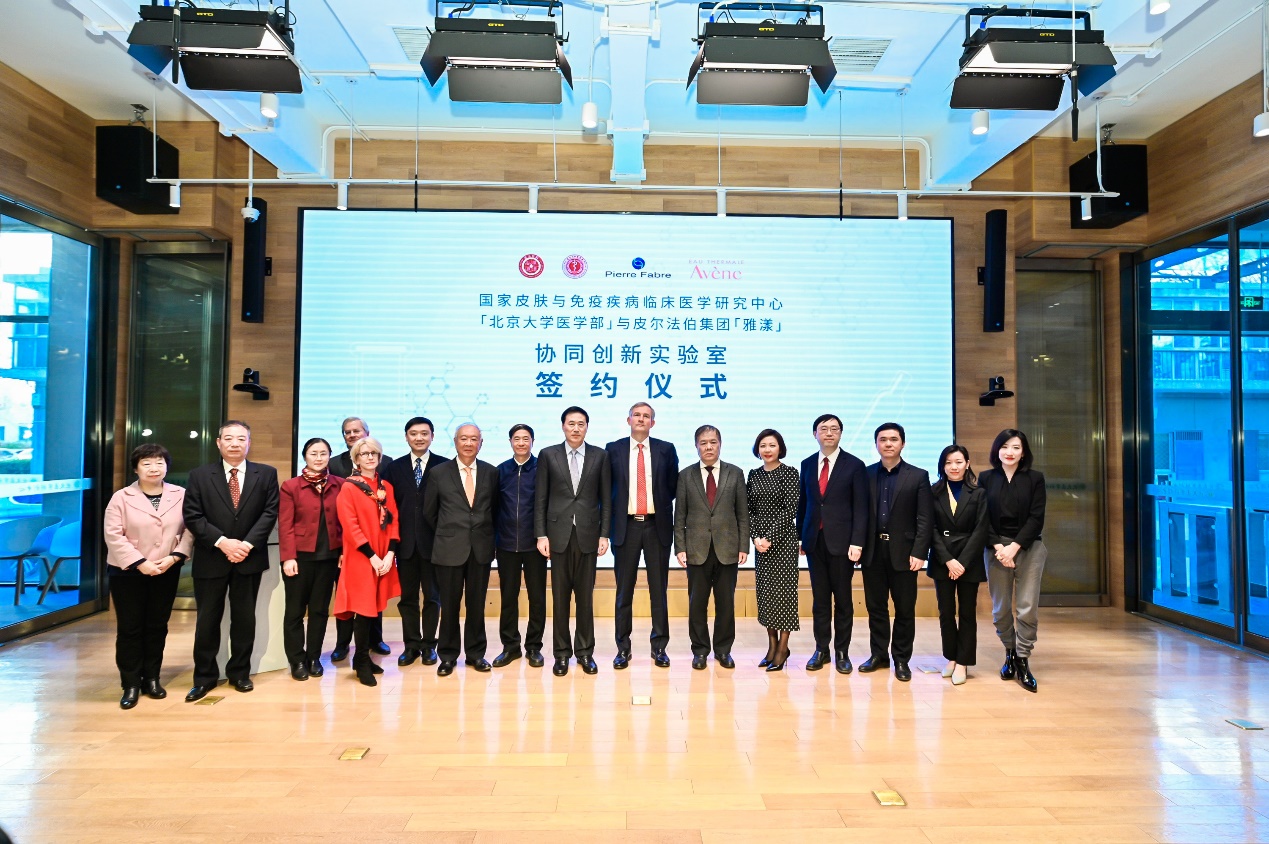 12月3日,国家皮肤与免疫疾病临床医学研究中心-皮尔法伯集团皮肤健康促进协同创新实验室签约仪式在北京大学医学部隆重举行。法国驻华大使M. Laurent BILI罗梁先生,皮尔法伯皮肤学护肤品中国区总经理崔庆爱女士,北京大学党委常务副书记、医学部党委书记刘玉村教授,北京大学第一医院院长刘新民教授,国家药品监督管理局科技和国际合作司一级巡视员毛振宾先生,北京大学医学部副主任肖渊,以及医学部部分职能处室领导、北京大学第一医院皮肤科核心组成员和知名专家、皮尔法伯集团管理层代表共同见证了签约仪式。